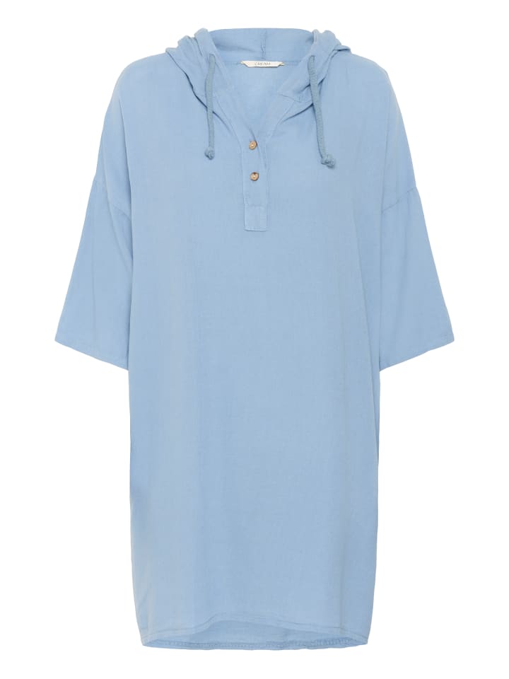 Повседневное платье-туника с капюшоном, мягкого, струящегося силуэта и прямого кроя. Планка на пуговицах и закатанные рукава дополняют дизайн.