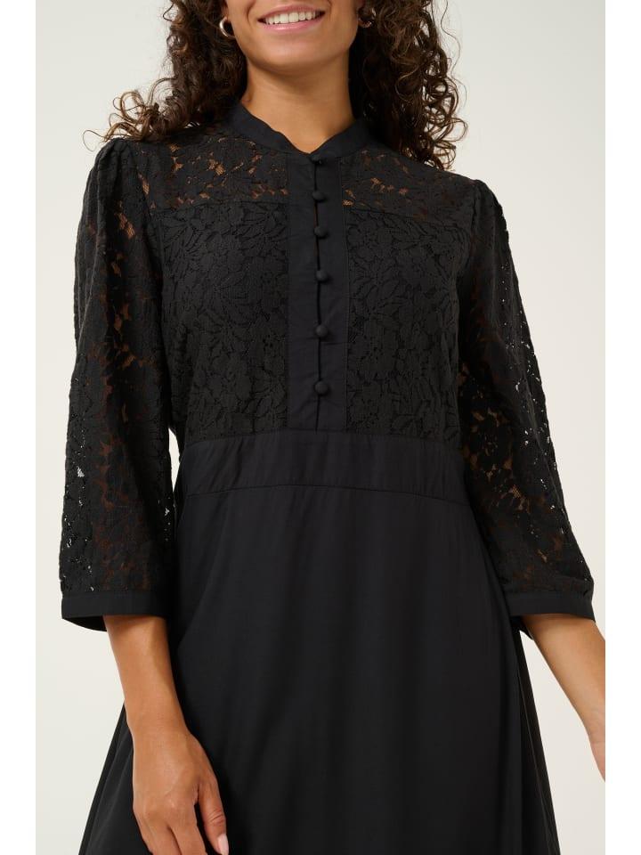 Кружевное платье прямого кроя с воротником-стойкой, рукавами три четверти и изящными кружевными деталями на лифе, рукавах и подоле. Спереди застежка на скрытые пуговицы.