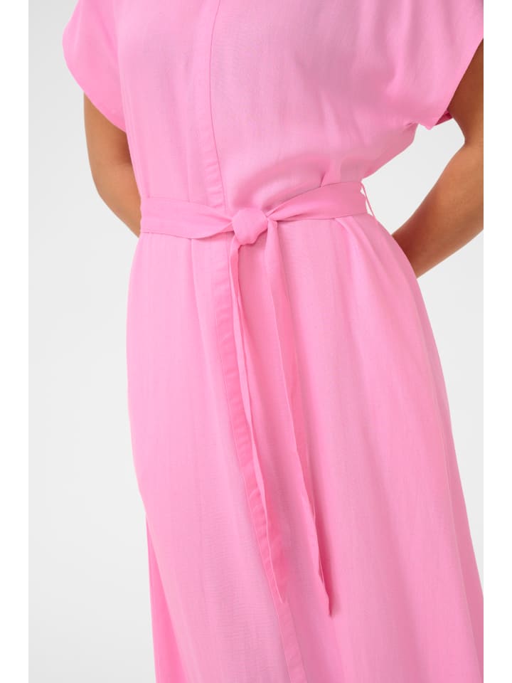 Платье миди с V-образным вырезом, короткими рукавами и прямым силуэтом. Легкая, мягкая ткань, завязывающийся пояс для гибкой талии.