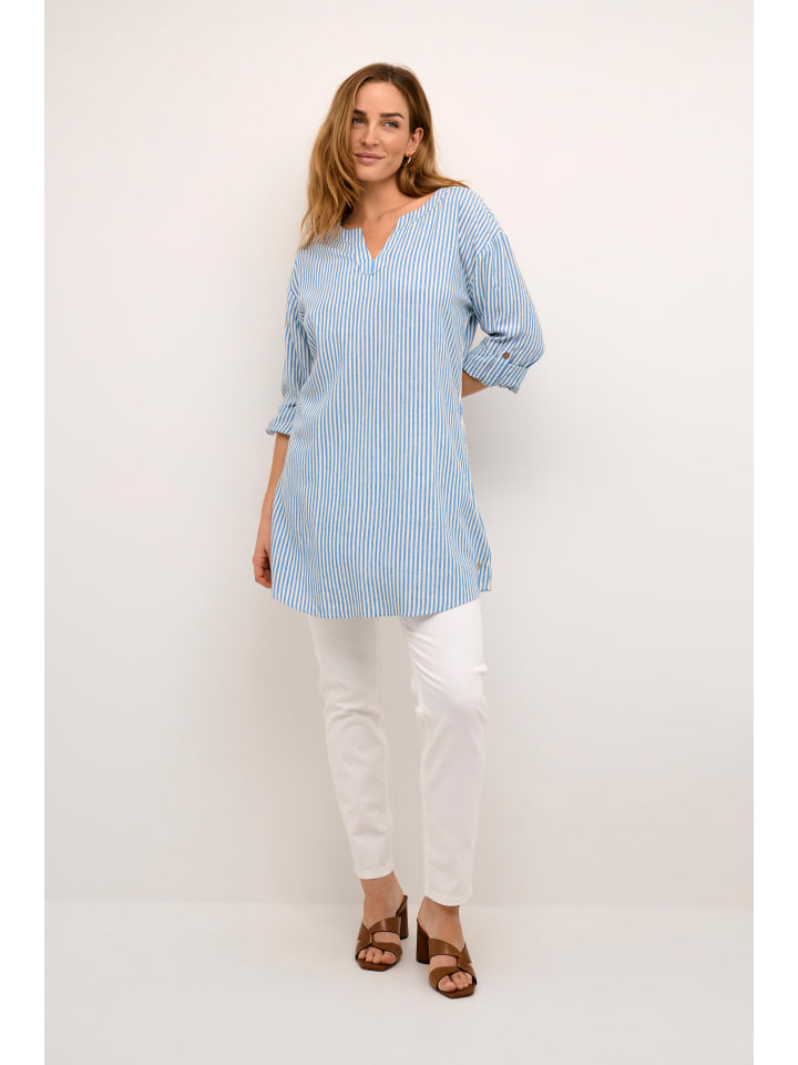 Туника прямого, свободного покроя, с эффектным V-образным вырезом и длинными рукавами на пуговицах. Гладкая поверхность, длина до бедра.