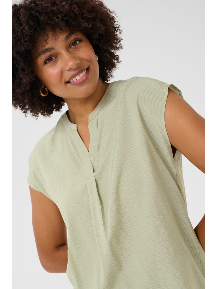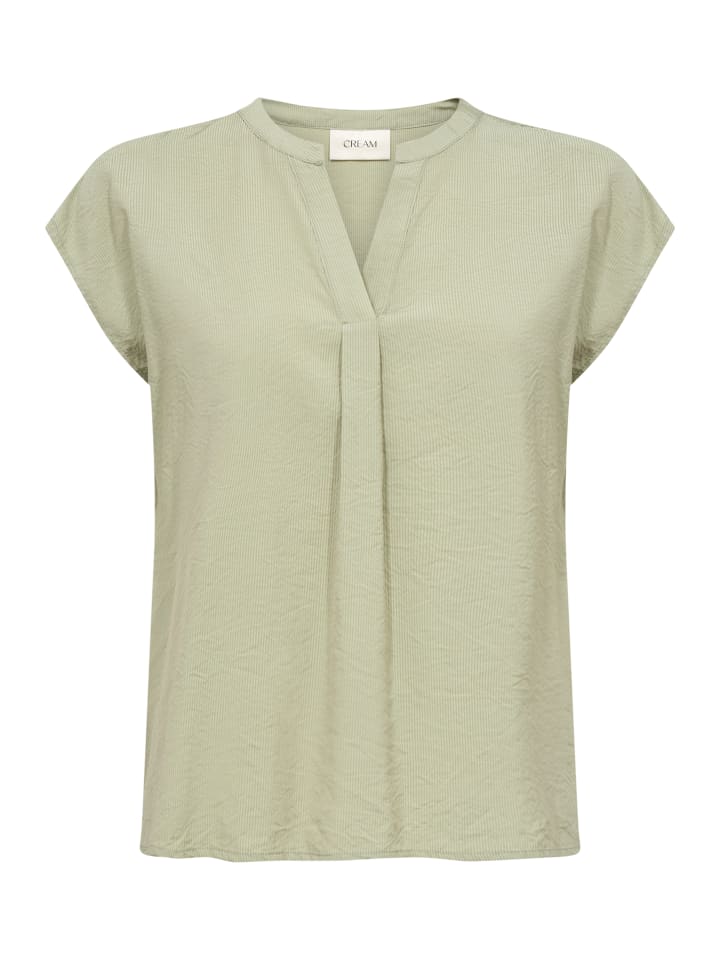 Верх впечатляет прямым кроем, мягкой текстурой и V-образным вырезом. Короткие рукава и аккуратный подол создают современный повседневный образ.