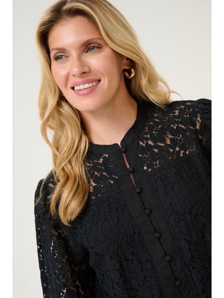 Эта кружевная блузка впечатляет своим прямым кроем, прозрачной цветочной структурой, воротником-стойкой, рукавами длиной 3/4 и застежкой на пуговицы по всей длине.