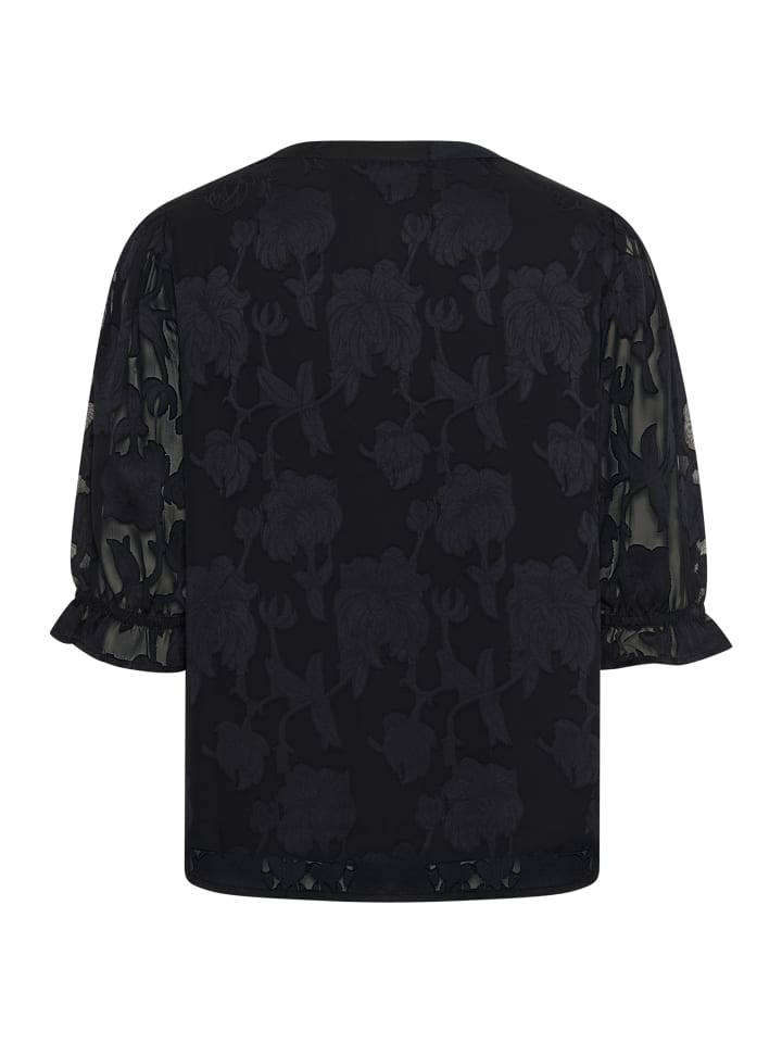 Блузка прямого кроя, с полупрозрачными рукавами до локтя и цветочным узором по всей длине. Разрез на горловине завершает дизайн.