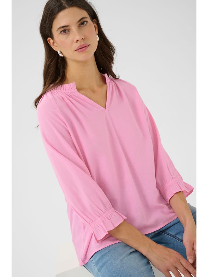 Блузка выделяется свободным кроем, мягкой отделкой, присборенным круглым вырезом с V-образным разрезом, рукавами длиной 3/4 и эластичными манжетами с воланами.