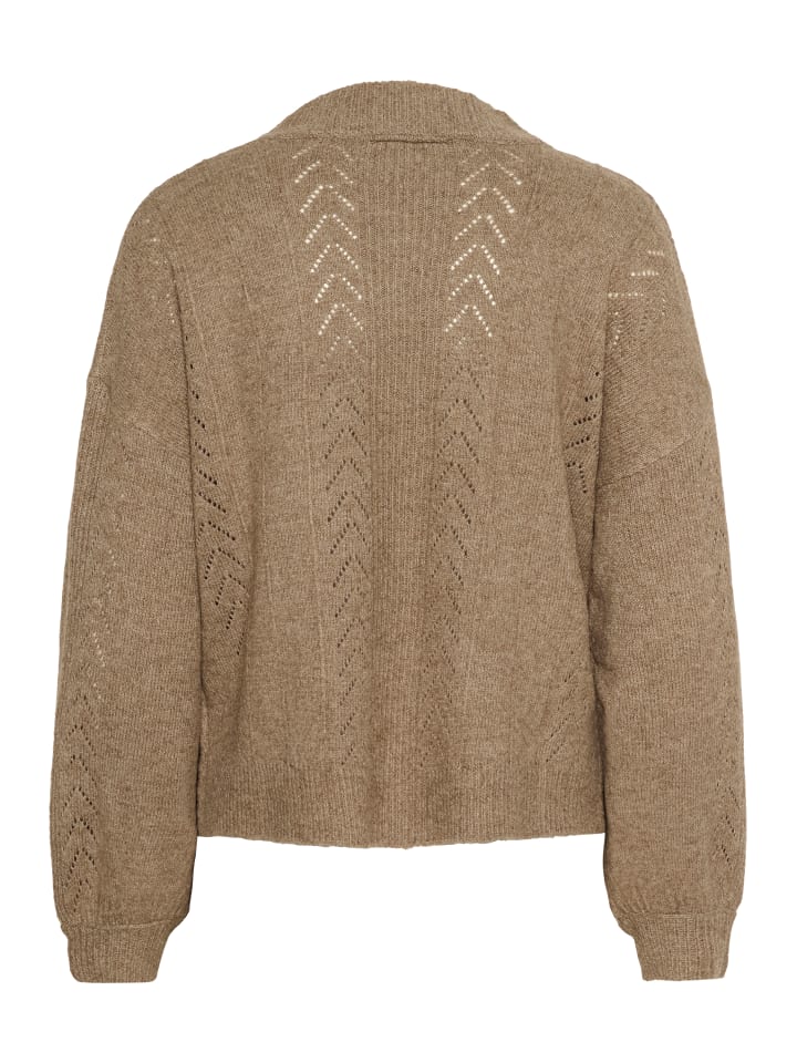 Кардиган крупной вязки с мягким кроем, V-образным вырезом и крупными пуговицами. Воздушные ажурные детали, спущенная линия плеча и объемные рукава.