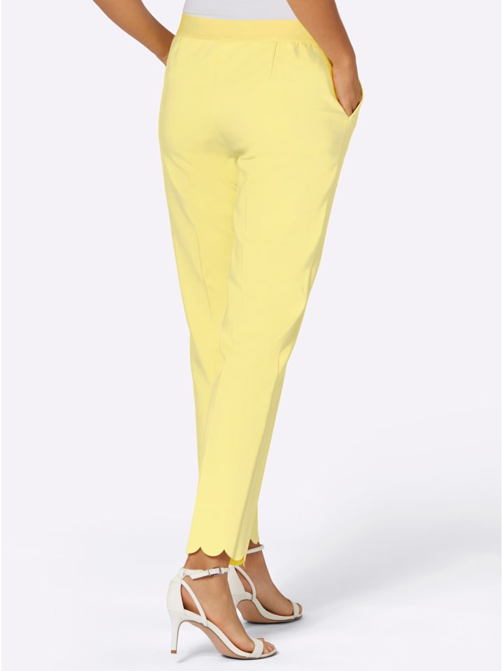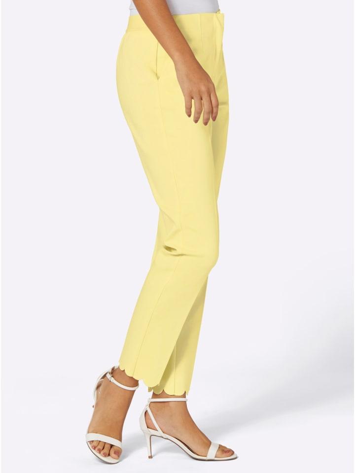 Эти брюки - элегантный спутник с изюминкой! Манжеты на штанинах украшены красивыми фестончатыми краями. Эластичный пояс обеспечивает максимальный комфорт. Слегка укороченный крой с заутюженными складками спереди и сзади для стройнящего эффекта. Застежка на крючок, внутренняя кнопка безопасности и два кармана. Ширина до щиколотки: около 34 см. Ремень в комплект не входит.
