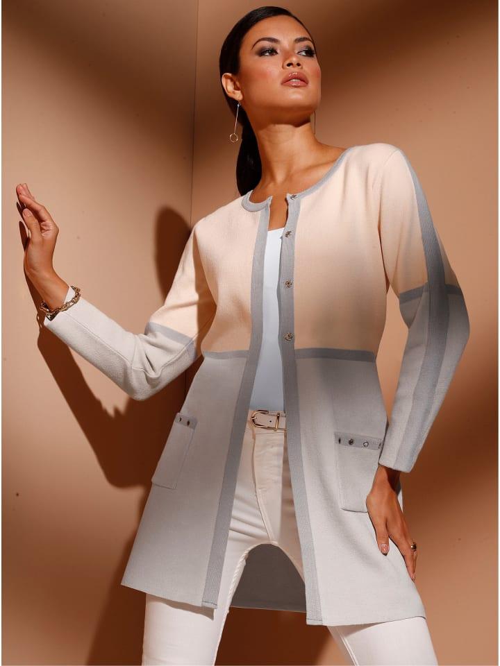 Длинный кардиган, подчеркивающий фигуру: контрастные вертикальные полосы визуально удлиняют силуэт, а горизонтальная полоса подчеркивает талию. Все края отделаны контрастным цветом, а два кармана украшены яркими декоративными заклепками. Передняя часть застегивается на кнопку по всей длине.