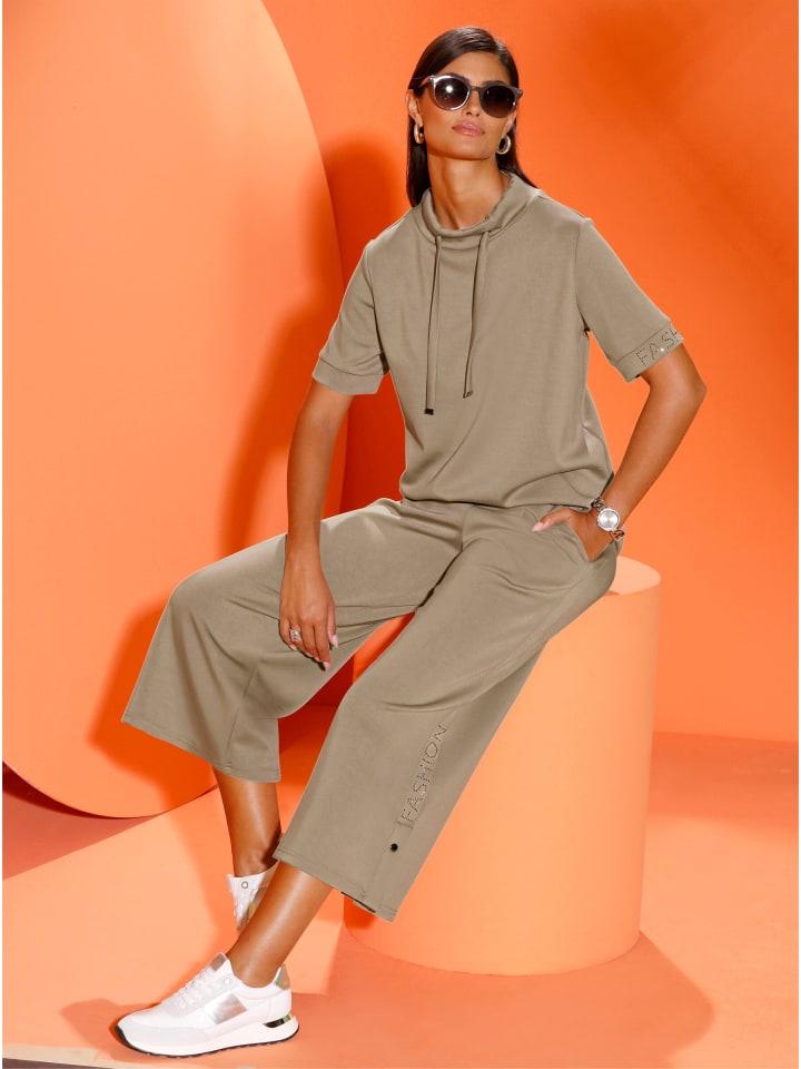 Ощутите комфорт! Эти брюки-кюлоты порадуют вас мягкой тканью с шелковистым матовым блеском и характерным широким кроем 7/8. Броская надпись из блестящих серебряных стразов на одном из высоких боковых разрезов штанины - настоящая приманка для глаз. Они имеют приятный широкий эластичный пояс и широкие складки спереди. Два кармана в боковых швах. Боковые разрезы на кнопках. Ширина стопы примерно... 64 см.