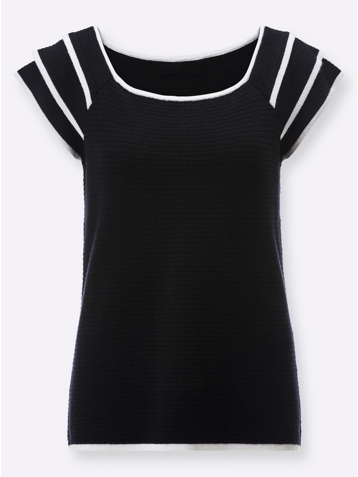 Удивительно мягкая пряжа с добавлением вискозы ECOVERO от Lenzing и эффектные контрасты делают этот свитер с квадратным вырезом популярным предметом вязания. Изюминкой являются спущенные плечи, каждое из которых связано в три слоя с контрастной каймой.