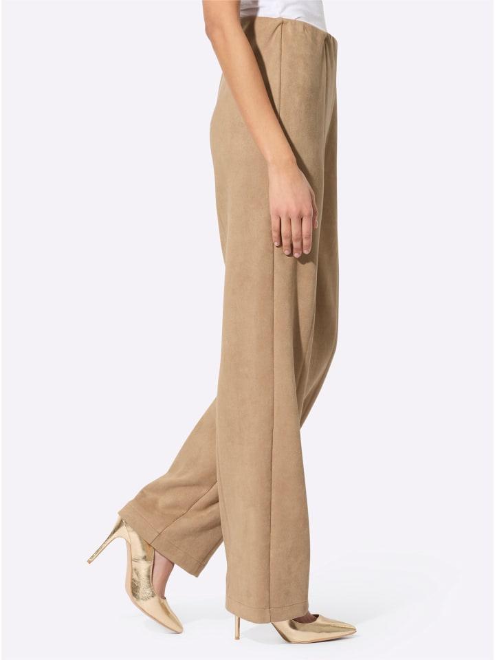 Выглядят как натуральная замша, но гораздо проще в уходе и долговечнее: брюки из искусственной замши с высоким притачным поясом и удобным внутренним эластичным поясом. Разделительные швы спереди и сзади визуально удлиняют ногу. Изготовлены из переработанного полиэстера. Ширина до щиколотки примерно 48 см.