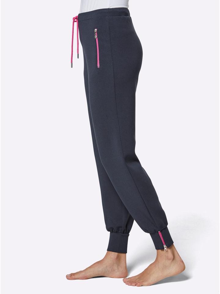 Брюки: Приятная на ощупь, хорошо сохраняющая форму трикотажная ткань благодаря высокому содержанию модала впечатляет эластичностью и легким блеском. Молнии на боковых карманах и эластичные манжеты добавляют контрастные акценты. На карманах - подвески с логотипом.