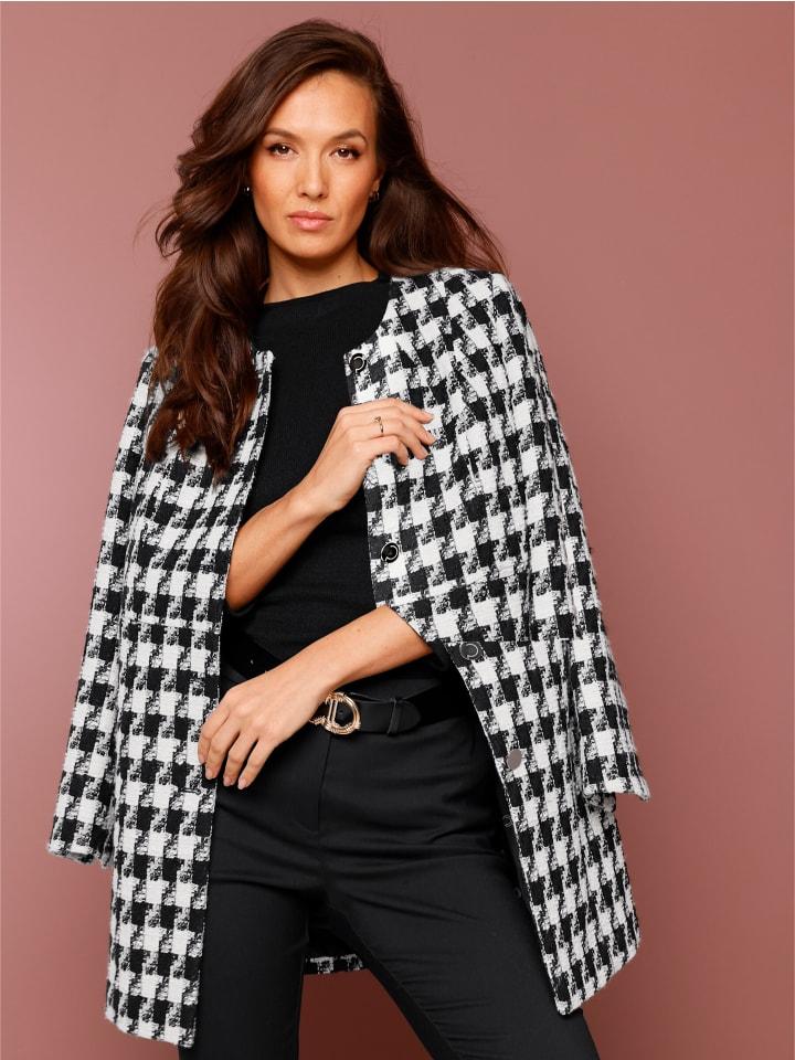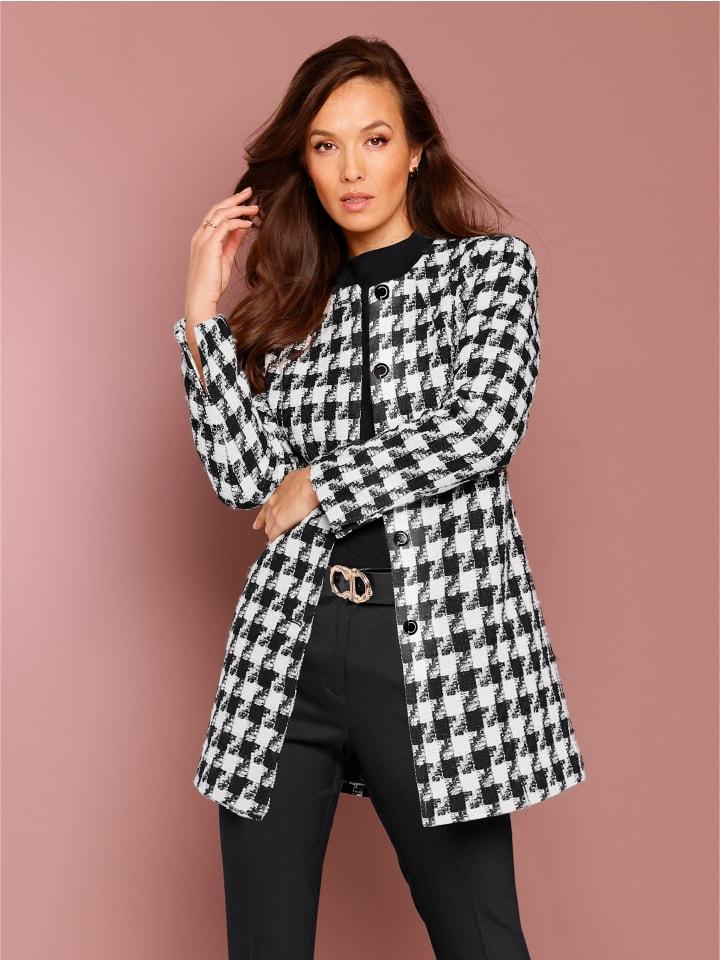 В дизайнерском стиле: элегантный шерстяной блейзер с узором гусиная лапка. Удлиненный крой с круглым вырезом, выгравированными пуговицами с логотипом и моделирующими фигуру разделительными швами спереди и сзади. Манжеты рукавов с небольшим разрезом. Высококачественная внутренняя часть с набивной подкладкой, подплечниками и металлическими цепочками. Приятная теплая шерстяная смесь. С переработанным полиэстером.
