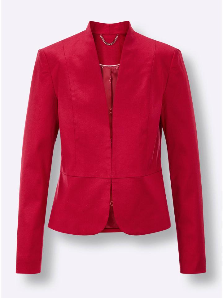Стильный короткий жакет из лиоцелла с имитацией баски и закругленным подолом. Глубокий V-образный вырез, тонкие подплечники, внутренняя застежка на крючок и моделирующие фигуру швы. Смесь лиоцелла и хлопка особенно комфортна в теплые дни. Подкладка с логотипом, металлическая цепочка в качестве вешалки.