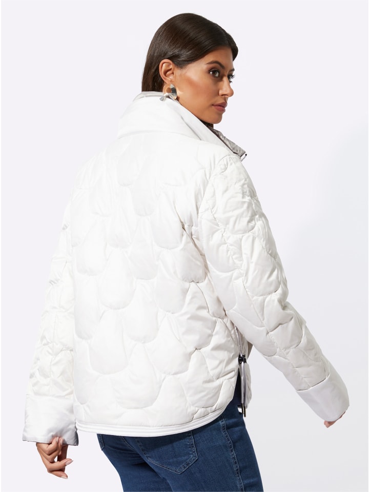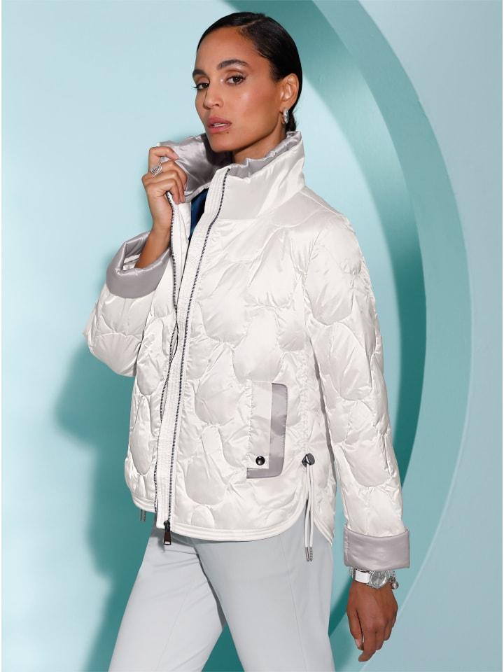 Высококачественный и невероятно модный спутник для межсезонья: дышащая, легкая стеганая куртка на пуху абсолютного качества. Двойной воротник-стойка на мягкой подкладке контрастного цвета с внутренней стороны, манжеты длинных рукавов также контрастные. Два практичных кармана контрастного цвета с декоративными пуговицами и внутренний карман. Низ слегка закруглен и немного удлинен сзади. Закругленные боковые разрезы с кулиской и завязками создают великолепный образ и регулируются по размеру.