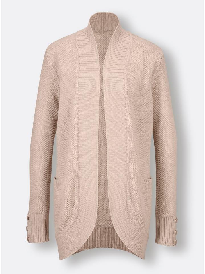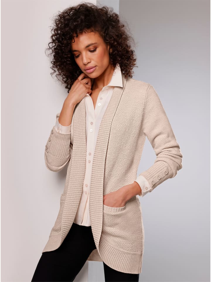 Кардиган из вискозы и натуральной шерсти. Теплый, тонкий трикотаж с узорчатым рисунком. Удлиненный крой с открытым передом и отделкой в рубчик. Высокие манжеты в рубчик с планкой с имитацией пуговиц и декоративными пуговицами с логотипом на длинных рукавах. Вшитые карманы. Перламутровый кулон с логотипом. Качество ECOVERO от Lenzing.