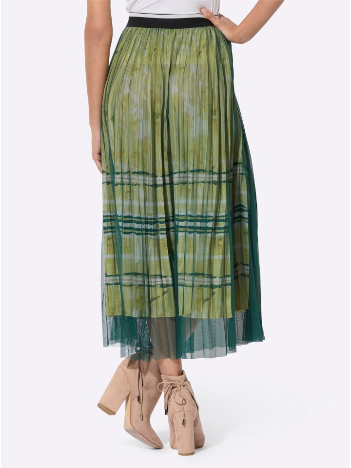 Энергичный на весь день: широкая, струящаяся юбка в складку с удобным поясом на резинке по всему периметру. Верхний прозрачный сетчатый слой остается плотным, что подчеркивает нижний слой из принтованного жоржета, одновременно уменьшая его прозрачность.