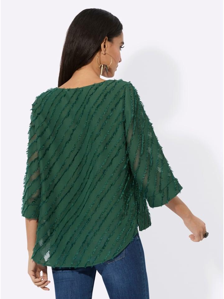 Модная бахрома: блузка на плотной подкладке из креповой ткани. Круглый вырез горловины и закругленный, слегка расширенный сзади подол. Рукава длиной 3/4 остаются слегка прозрачными и заканчиваются двухслойной манжетой с разрезом.
