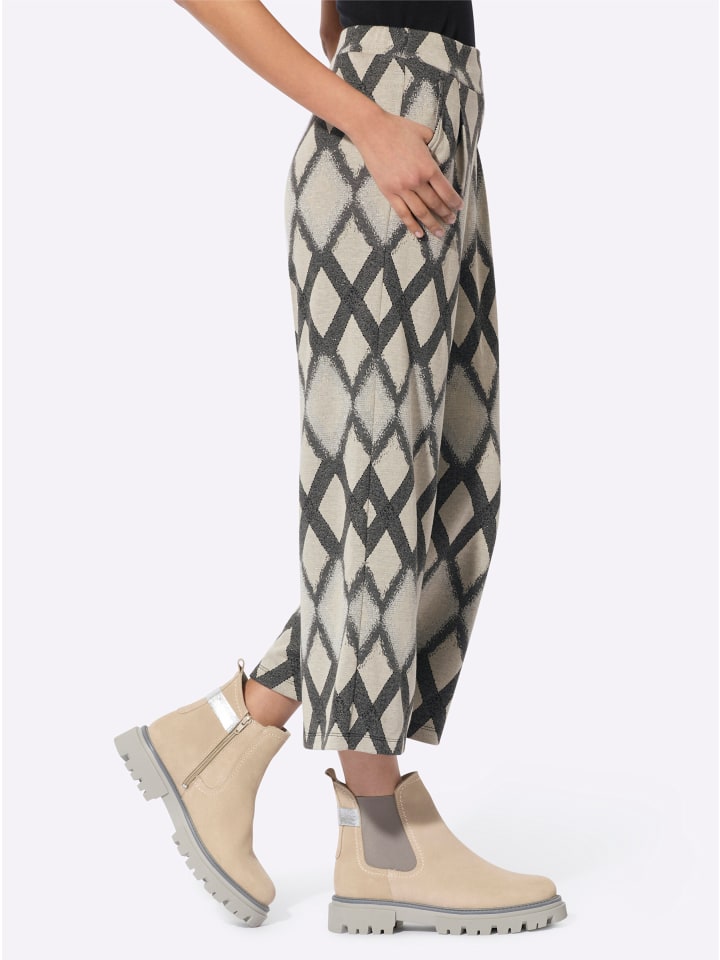 Эти брюки-кюлоты из смесовой модальной ткани с жаккардовым узором в виде ромбов, некоторые с блестящей пряжей, очень модные. Удобный трикотажный материал со складками на V-образном поясе спереди и эластичным поясом сзади. Боковые карманы. Ширина до щиколотки примерно 60 см.