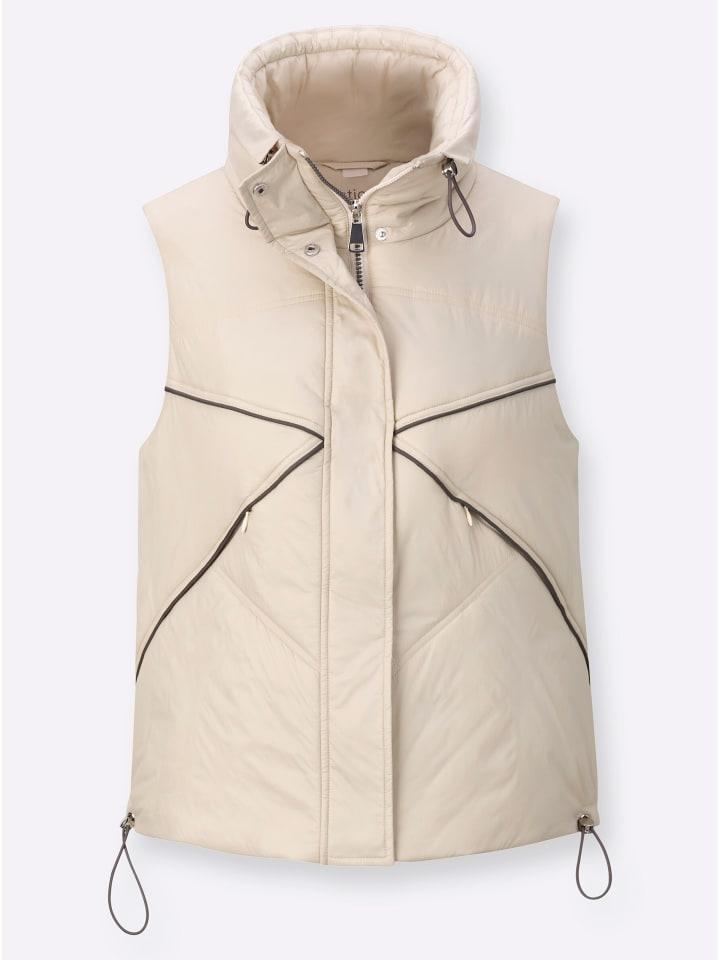Модный короткий стеганый жилет с объемным, теплым воротником-стойкой и застежкой на молнию с потайной кнопкой. Два кармана на молнии скрыты в контрастных разделительных швах. Подол, как и воротник-стойка, регулируется по ширине шнурком с металлическим фиксатором.