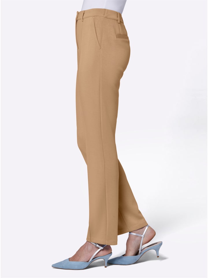 Брюки из модала с отличной посадкой благодаря высокому содержанию эластичности. Прошитая окантовка спереди создает эффект удлинения и подчеркивает фигуру. Фигурный пояс, два передних кармана, вытачки и два декоративных кармана сзади. Ширина до щиколотки примерно 36 см. Без пояса.