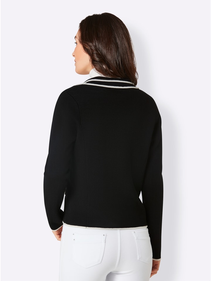 В привлекательном цветовом контрасте: мериносовый трикотажный блейзер с высококачественной миланской вязкой - эксклюзивный натуральный продукт из мериносовой шерсти премиум-класса. Очень тонкий, супермягкий и невероятно удобный. Облегающий крой с экстравагантным воротником с двойными лацканами и моделирующими фигуру венскими швами. Пуговица с выгравированным логотипом. Два кармана с клапанами.