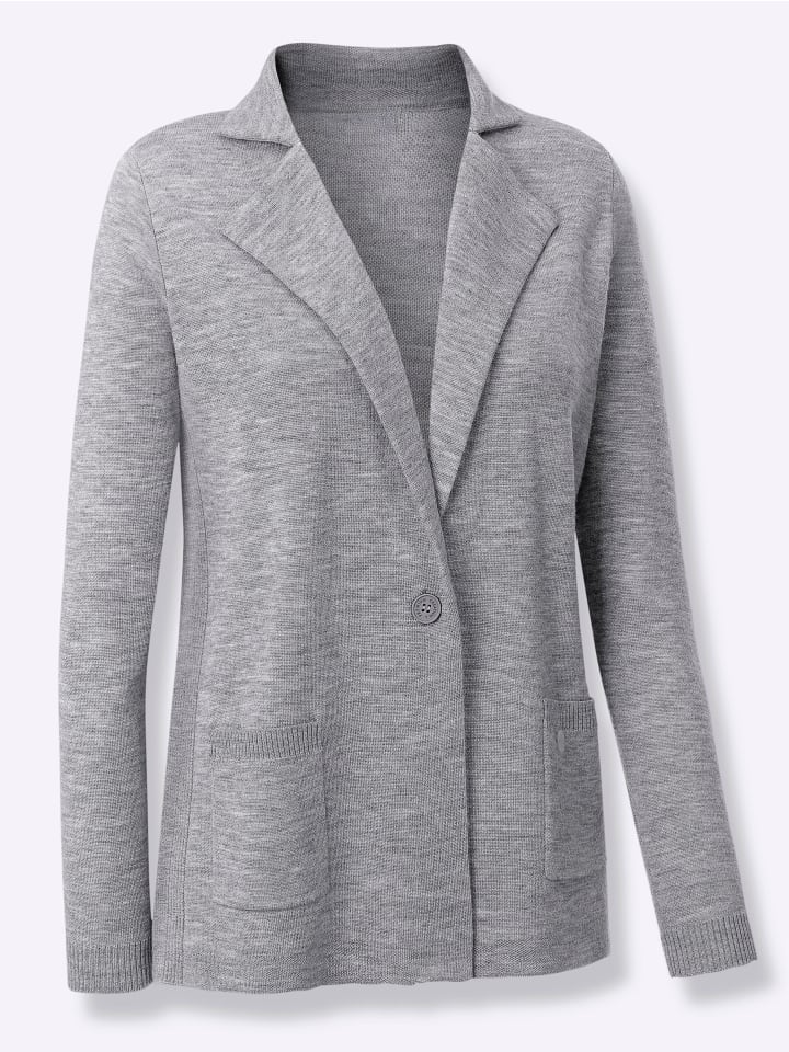 Пиджак из мериносовой шерсти. Эксклюзивный, хорошо сохраняющий форму тонкий трикотаж с высококачественным жаккардовым узором или в двух однотонных цветах. Невероятно теплый и мягкий. Воротник с лацканами, застежка на одну пуговицу с тисненым логотипом и накладные карманы. Ребристая отделка по бокам. Длинные рукава. Перламутровый кулон с логотипом.