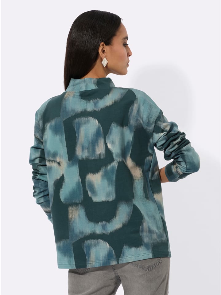 Принт на мягкой, эластичной толстовке напоминает переливающееся северное сияние. Воротник-стойка регулируется по ширине с помощью хлястика и завязки. Свободный крой с длинными рукавами. Сертифицировано OCS, изготовлено из органического хлопка.