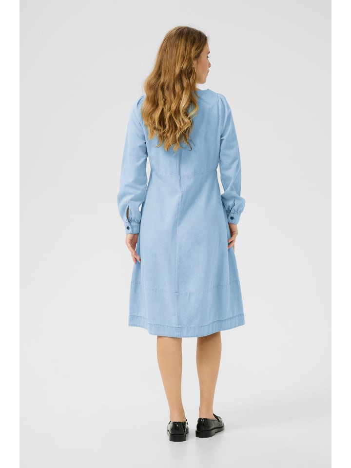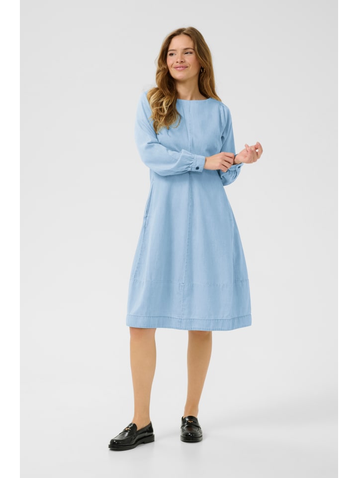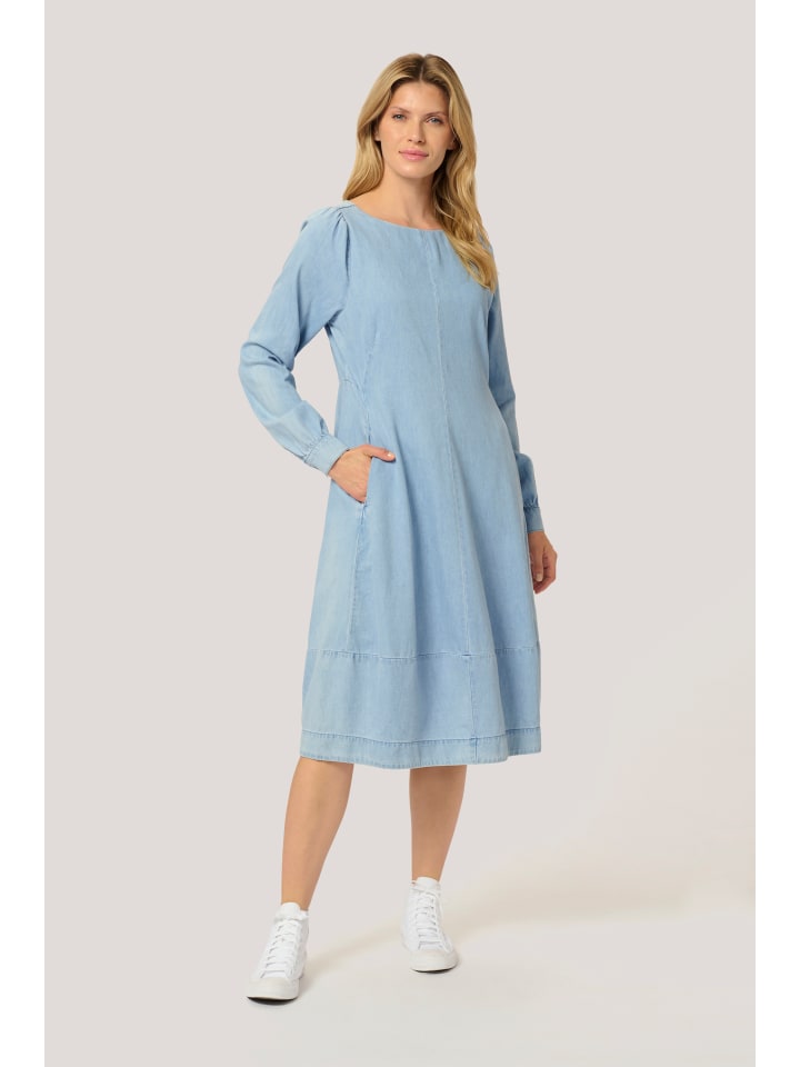 Это платье А-силуэта имеет прямой, слегка расклешенный крой, круглый вырез горловины, длинные рукава и видимые разделительные швы.