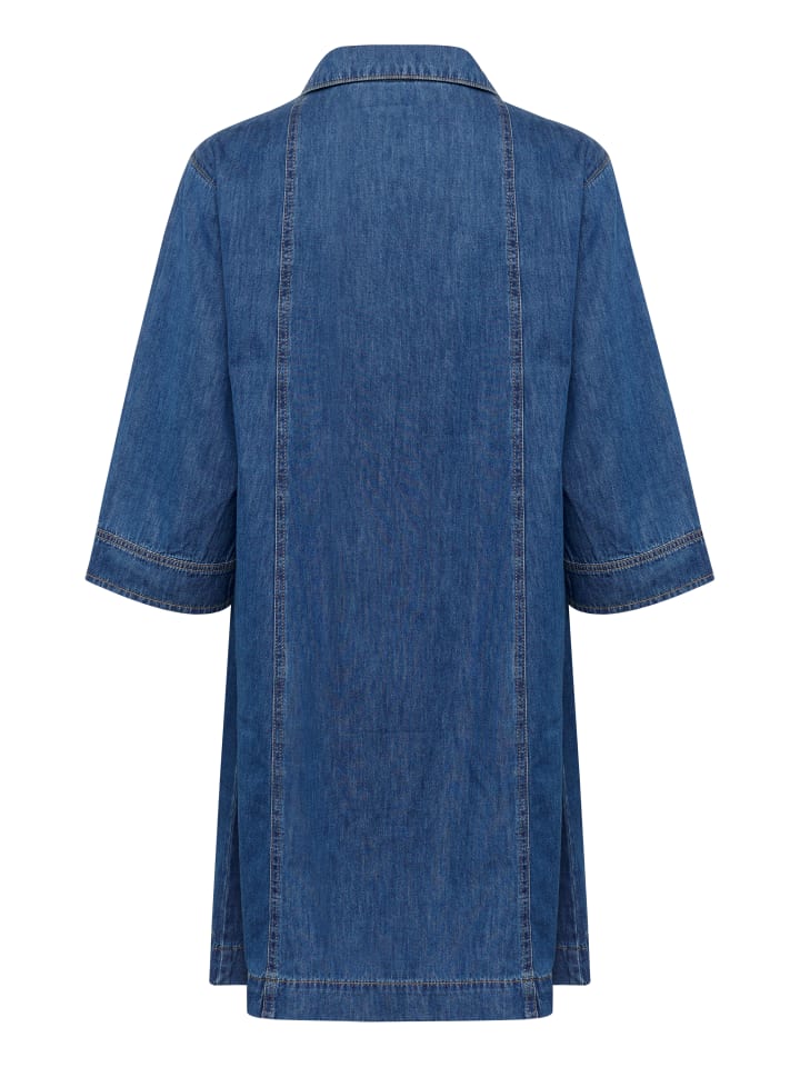 Джинсовое платье с утонченным А-образным силуэтом, мягкое на ощупь, с отложным воротником и рукавами три четверти. Передние карманы и контрастные швы добавляют акценты.