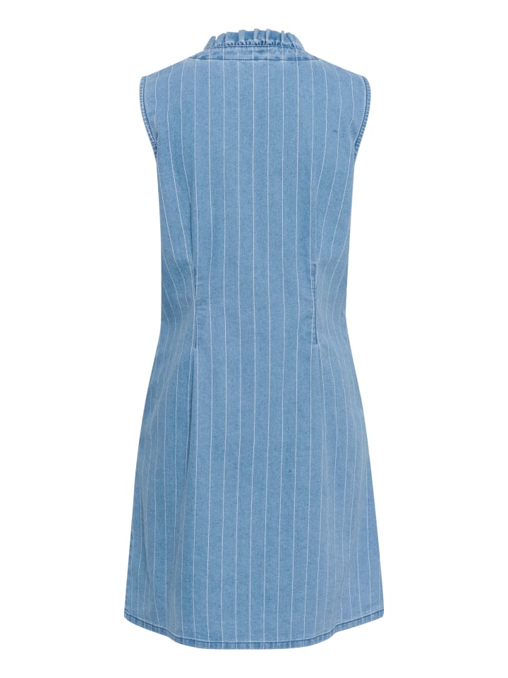 Платье без рукавов с планкой на пуговицах и слегка расклешенным кроем. Вертикальные полосы, оборки на V-образном вырезе и практичные боковые карманы.