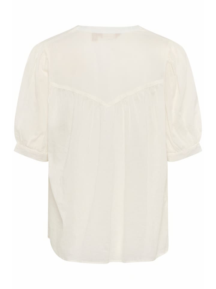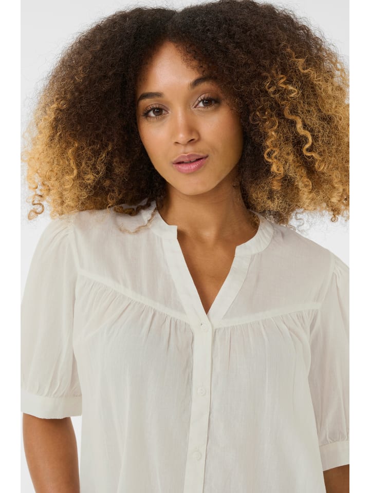 Блузка свободного кроя с застежкой на пуговицы спереди и короткими присборенными рукавами. V-образный вырез, узкий воротник-стойка и изящные плечи.