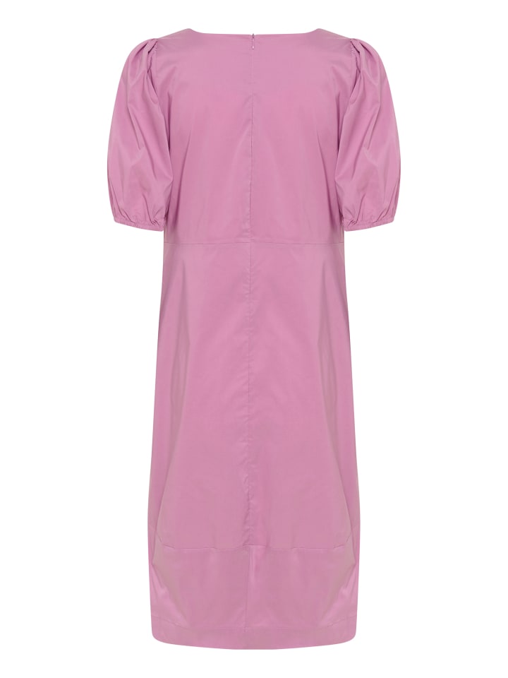 Это платье А-силуэта свободного кроя с элегантным V-образным вырезом и короткими рукавами-буфами. Длина до колена обеспечивает универсальный комфорт и подходит для многих случаев.