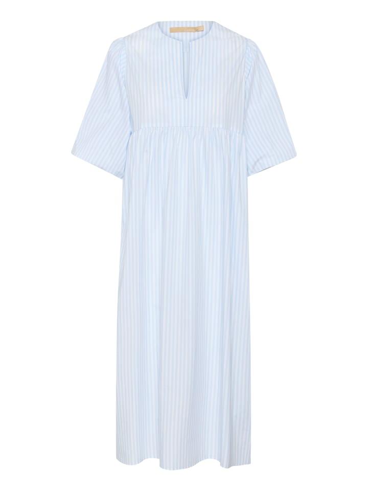 Платье миди в полоску с V-образным вырезом и короткими рукавами. Свободный силуэт со сборкой под грудью.