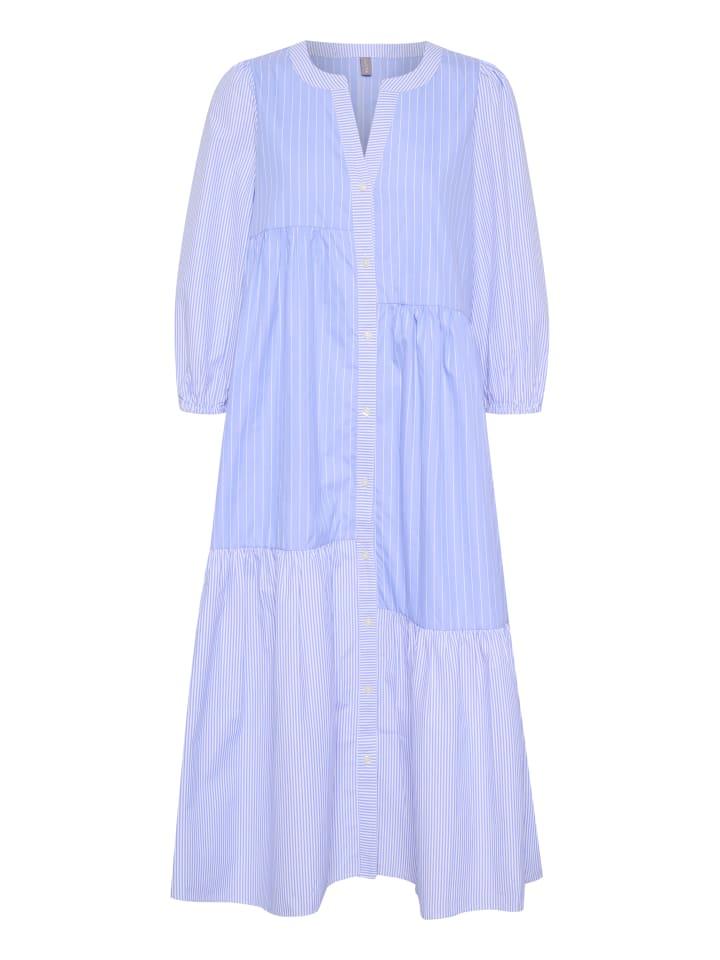 Платье миди свободного кроя с вертикальными полосками, ярусами и планкой на пуговицах. V-образный вырез, рукава длиной 3/4 с эластичным подолом.