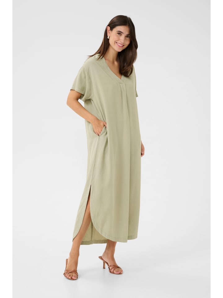 Платье миди свободного прямого кроя, мягкое на ощупь, с V-образным вырезом и короткими рукавами. Изящная складка спереди и закругленный разрез по низу создают современный силуэт. Стирать при температуре 30°C. Не отбеливать. Не сушить в стиральной машине. Развешивать в тени в сухом виде. Гладить при температуре не выше 110°C. Профессиональная химчистка. Внешний материал: 100% лиоцелл. Длина миди с закругленным низом. Короткие рукава, свободный крой. V-образный вырез и складка спереди. Материал: 100% лиоцелл.