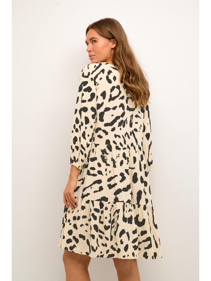 Платье свободного кроя с многоуровневой застежкой на пуговицы спереди, круглым вырезом горловины и рукавами три четверти. Мягкая драпировка и современный силуэт.