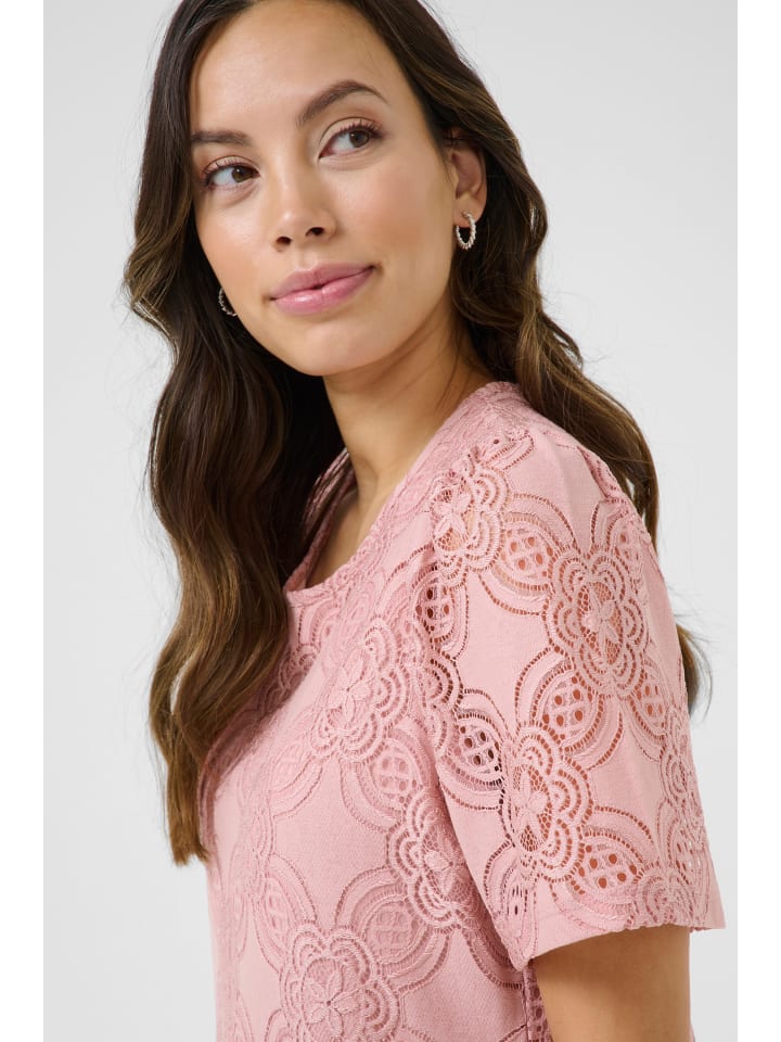 Платье миди с кружевным верхом и воздушной текстурой. Круглый вырез горловины, короткие рукава и расклешенный крой. Утягивающая талия подчеркивает силуэт.