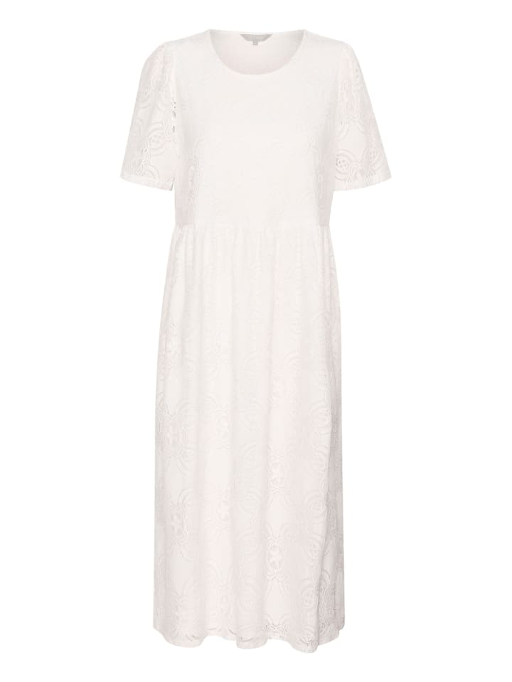 Платье миди с кружевным верхом и воздушной текстурой. Круглый вырез горловины, короткие рукава и расклешенный крой. Утягивающая талия подчеркивает силуэт.