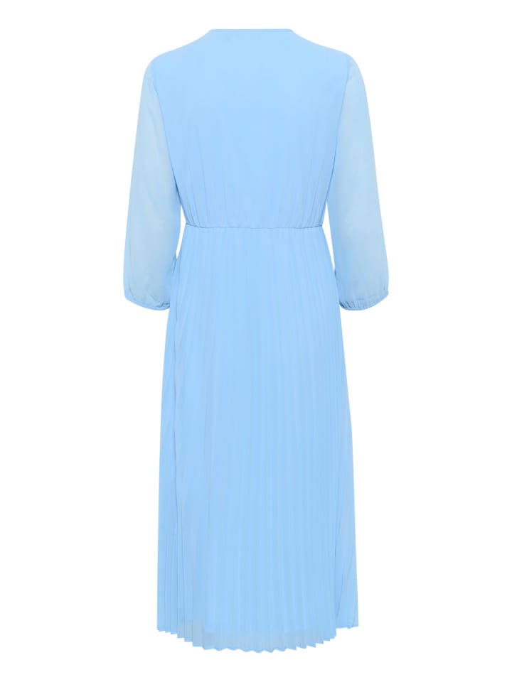 Элегантное платье миди с V-образным вырезом, верхом на запахе, длинными прозрачными рукавами и юбкой с тонкими складками. Удобный фасон для самых разных случаев.