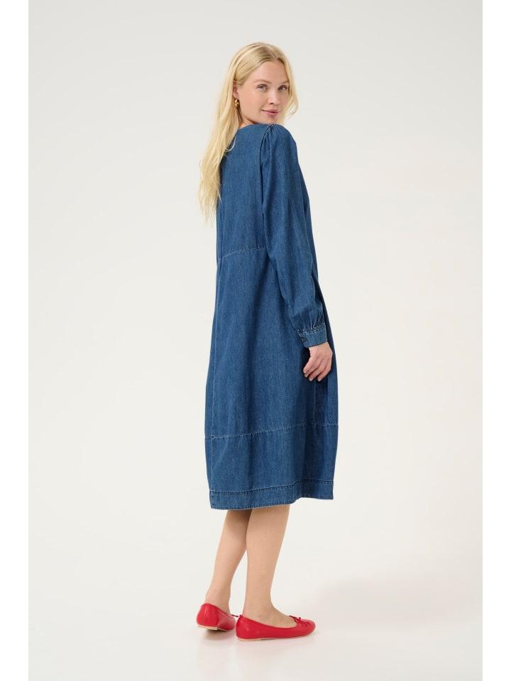 Это платье миди прямого силуэта, с длинными рукавами, V-образным вырезом и едва заметными швами по подолу, создающими неподвластный времени стиль.