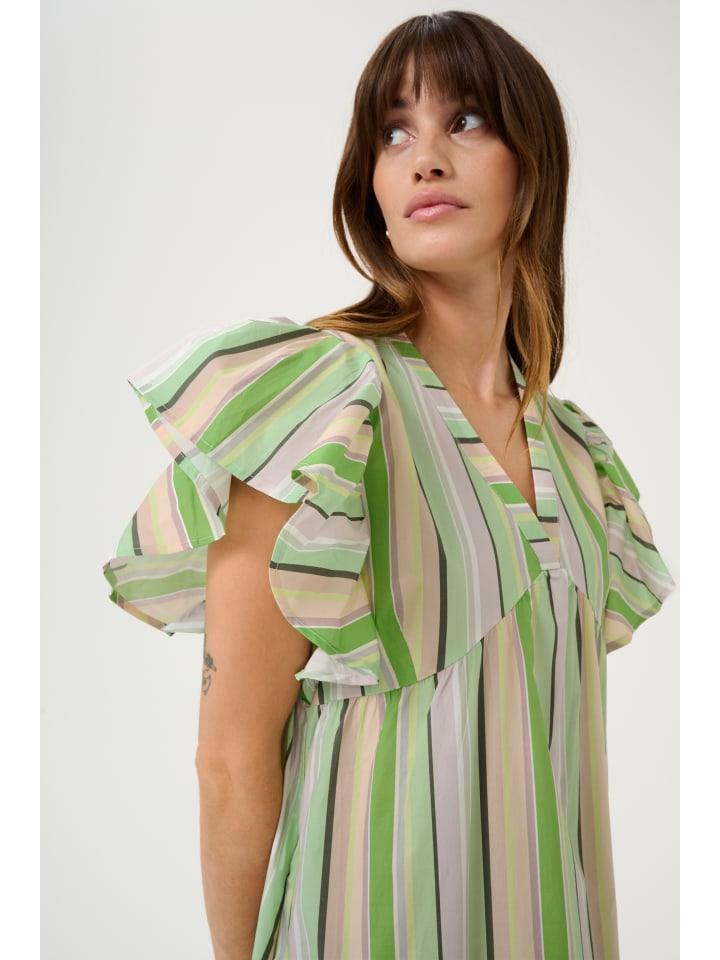 Платье миди в полоску, свободного кроя и с многоярусной юбкой. V-образный вырез и короткие, объемные рукава с оборками придают современный вид.
