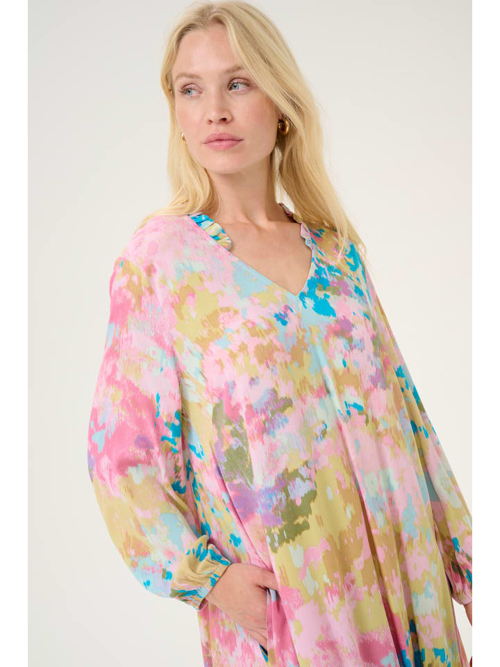 Легкое платье миди с плавной драпировкой, тонким V-образным вырезом и длинными присборенными рукавами. Мягкая, струящаяся текстура создает образ.