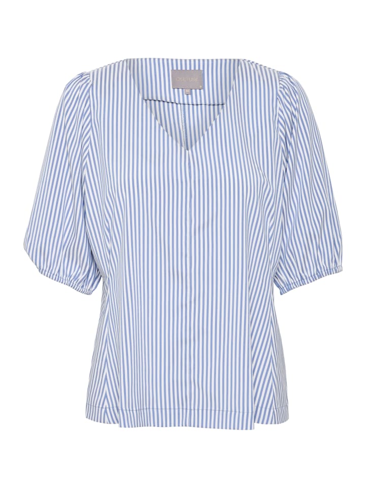 Блузка в полоску с текстурированной отделкой, V-образным вырезом, слегка присборенными рукавами и присборенными манжетами. Прямой, свободный крой для повседневного образа.