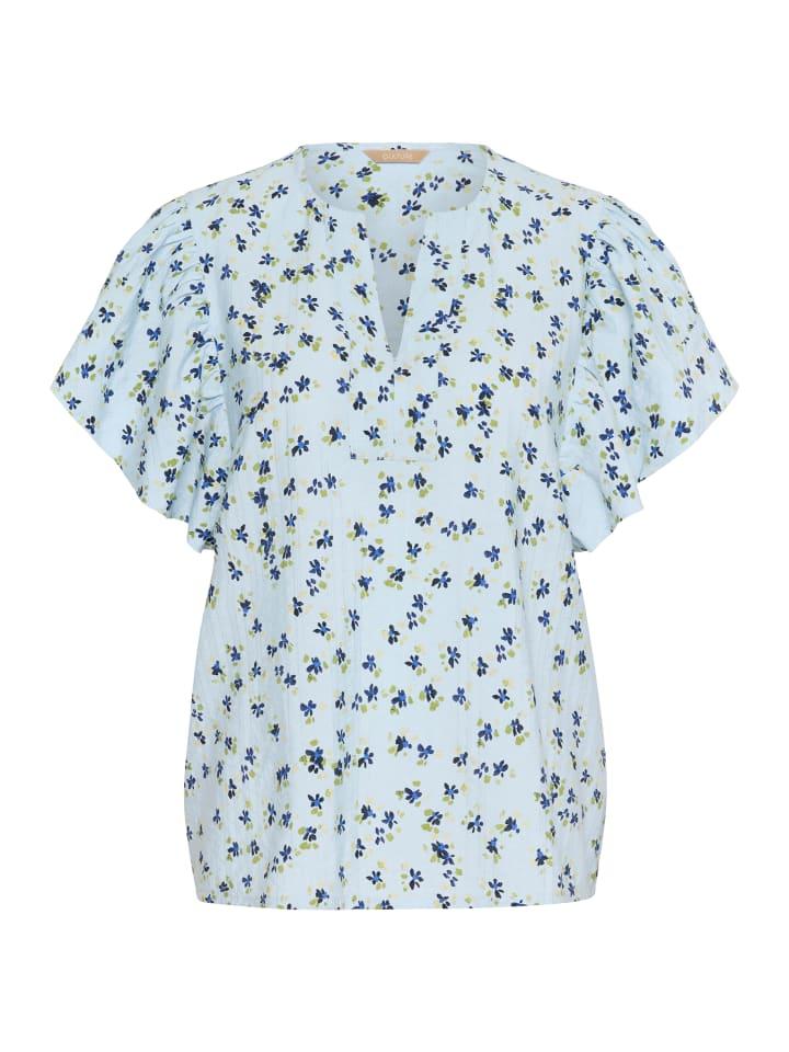 Эта блузка свободного кроя, с V-образным вырезом и двухслойными рукавами с оборками. Деликатная поверхность выглядит воздушной и легкой.