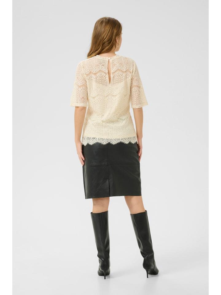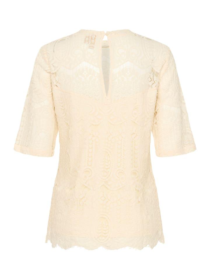 Кружевная блузка прямого кроя с круглым вырезом и рукавами до середины голени. Прозрачные кружевные вставки и фестончатый подол.