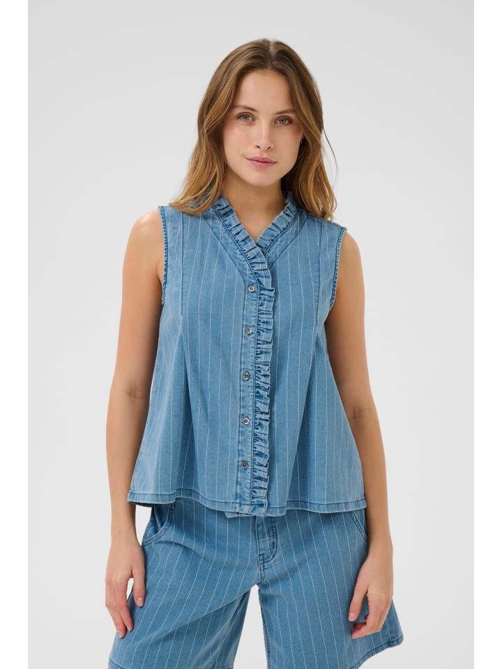 Джинсовая блузка без рукавов с тонкими вертикальными полосками и свободным расклешенным кроем. Оборки подчеркивают V-образный вырез и планку с пуговицами.