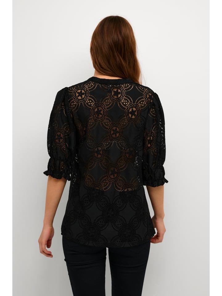 Блузка свободного силуэта с цветочным кружевом, V-образным вырезом и присборенными рукавами длиной 3/4. Полупрозрачная, мягкая на вид.