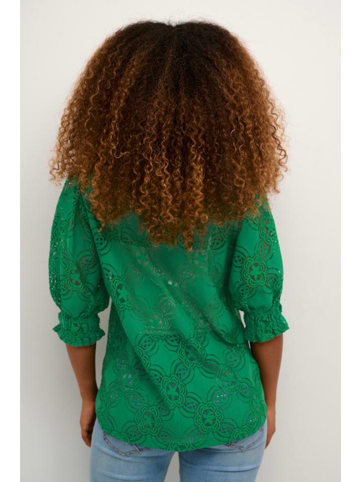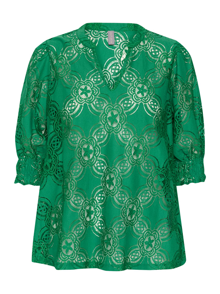 Блузка свободного силуэта с цветочным кружевом, V-образным вырезом и присборенными рукавами длиной 3/4. Полупрозрачная, мягкая на вид.