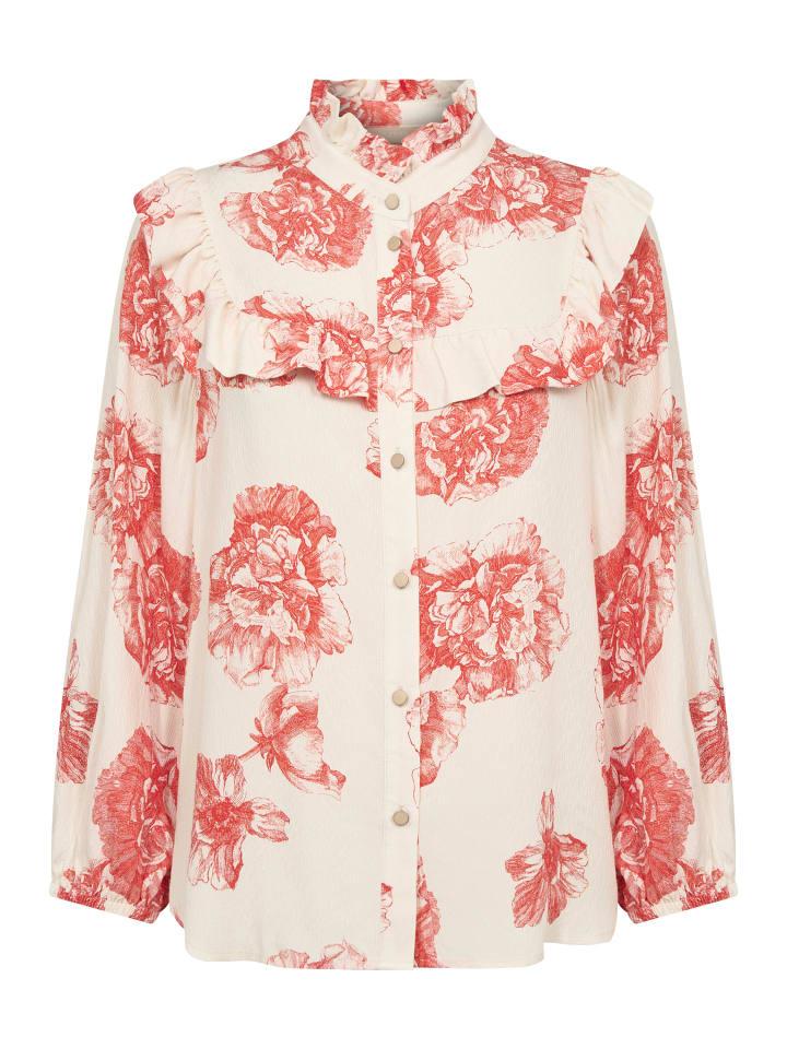 Блузка с оборками на высоком воротнике, длинными, слегка расклешенными рукавами и свободным кроем. Застежка на пуговицы спереди, мягкий, структурированный вид с цветочным принтом.