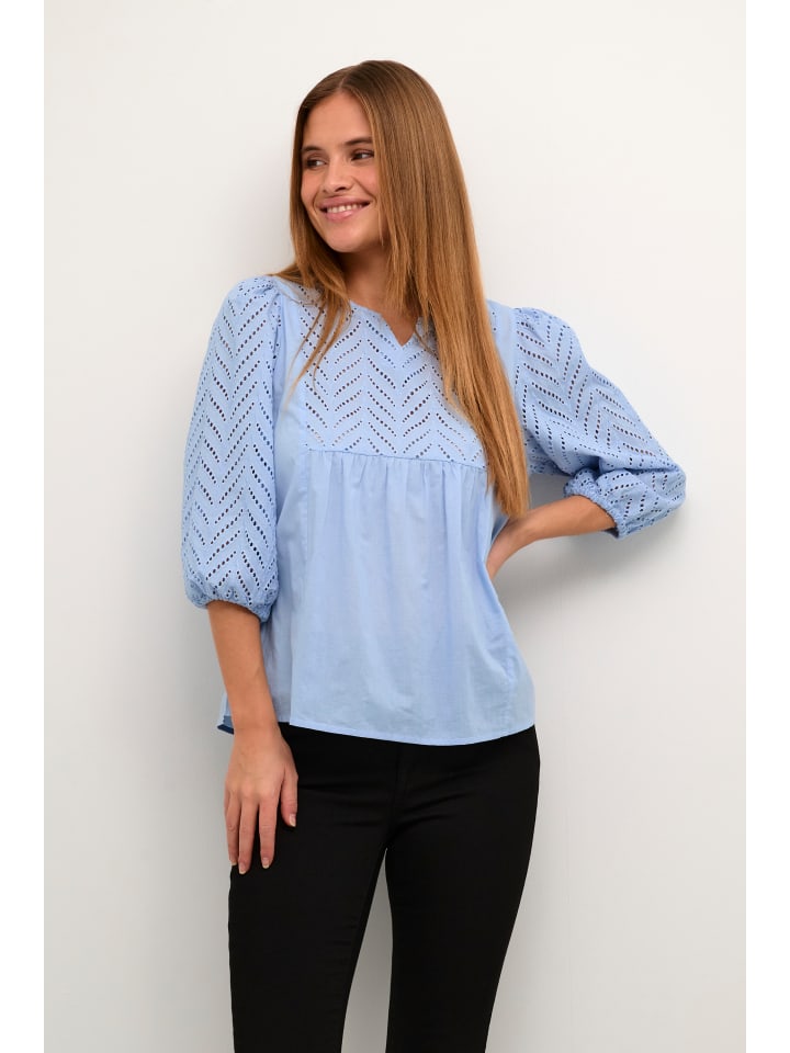Эта блузка имеет свободный крой, воздушный ажурный узор на торсе и рукавах, присборенную талию и V-образный вырез. Рукава длиной 3/4 с эластичным поясом.